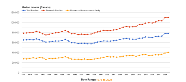 According to StatsCan: Median market income for Canadian families and unattached individuals was $68,700 in 2023, a 1.5% increase from $67,700 in 2022.